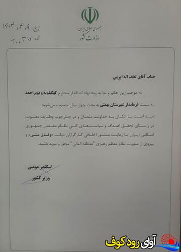 جناب حاج ایرمی حکم انتصاب فرمانداربهمئی را