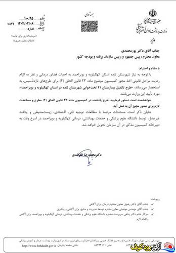 در این نامه، با اشاره به دستور کمیسیون موضوع ماده ۲۳ قانون و با توجه به نیاز شهرستانهای لنده و بویراحمد به ارتقای زیرساختهای درمانی، بر لزوم تسریع در روند بررسی و صدور این مجوز و همچنین تأمین منابع مالی موردنیاز برای اجرای کامل پروژه تأکید شده است.