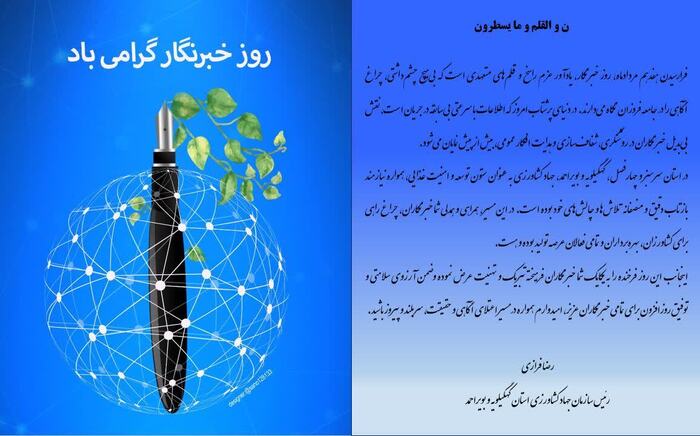 فرارسیدن هفدهم مردادماه، روز خبرنگار، یادآور عزم راسخ و قلمهای متعهدی است که بیهیچ چشمداشتی، چراغ آگاهی را در جامعه فروزان نگاه میدارند. اینجانب، به نمایندگی از خانواده بزرگ سازمان جهاد کشاورزی استان کهگیلویه و بویراحمد، این روز فرخنده را به یکایک شما خبرنگاران فرهیخته و دغدغهمند تبریک و تهنیت عرض مینمایم.