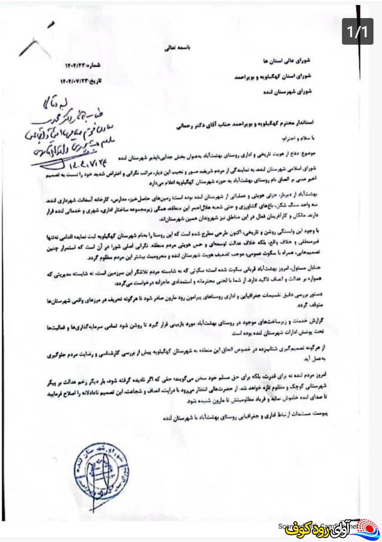 به گزارش آوای رودکوف، شورای شهرستان لنده با ارسال نامهای رسمی و مهرشده خطاب به جناب دکتر یدالله رحمانی، استاندار محترم کهگیلویه و بویراحمد و جناب سید محمد تقوی، فرماندار شهرستان لنده، نگرانی عمیق مردم لنده را نسبت به تصمیم اخیر مبنی بر الحاق روستای بهشتآباد به شهرستان کهگیلویه اعلام کرد.